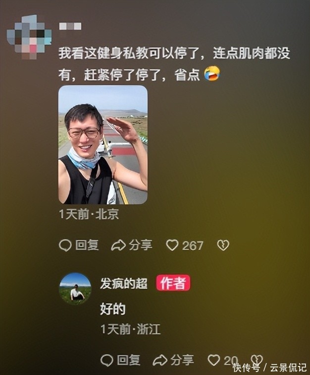 有网友打趣道:“某些开销真该省省!就说你那健身,练了这么久也没见肌肉线条出来,一个月花五千多,不如停掉吧!” 阿超态度平和,笑着回复“好的”,表示接受建议。